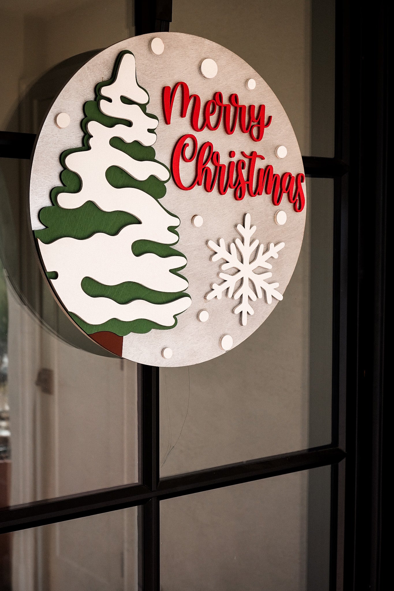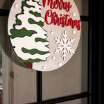 Merry Christmas Wooden Door Sign – Laser Cut Holiday Front Porch Décor | Snowy Tree & Snowflake Design
