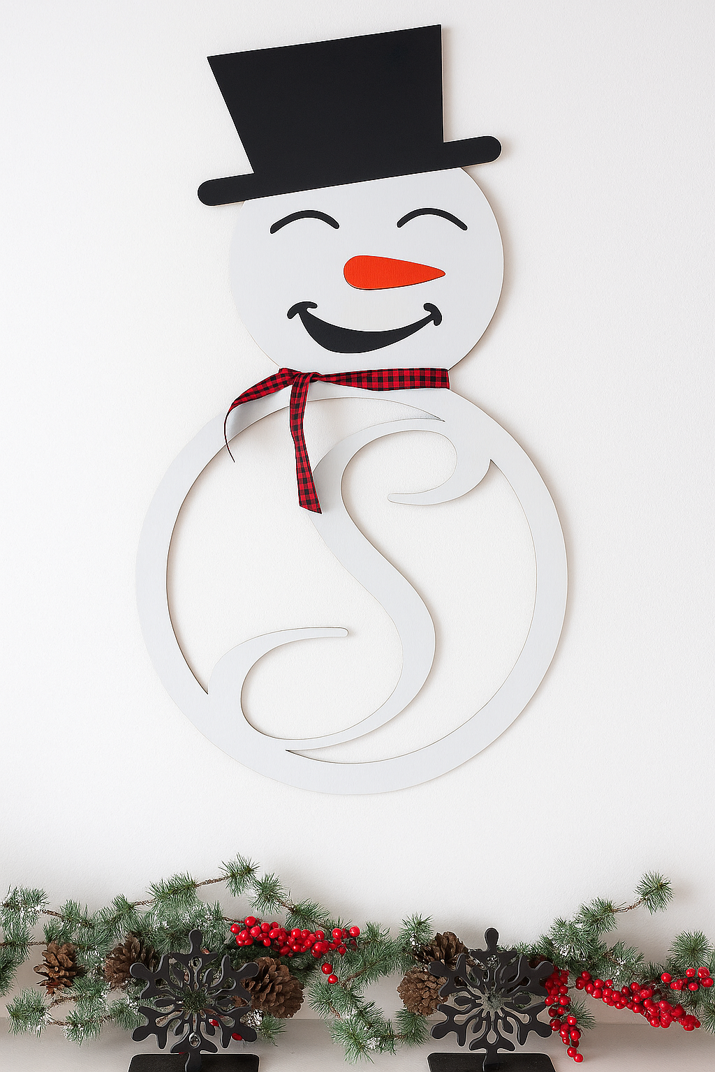 Meet The Perfect Snowman for your wall — a cheerful and timeless piece that brings holiday joy to any space! Crafted from durable ¼” plywood, this wall hanger combines playful charm with handcrafted quality. Standing 36x20 inches, it’s the perfect statement piece for your home this winter. With a classic top hat, bright carrot nose, and red-and-black plaid scarf, this snowman adds just the right mix of warmth and whimsy to your décor.