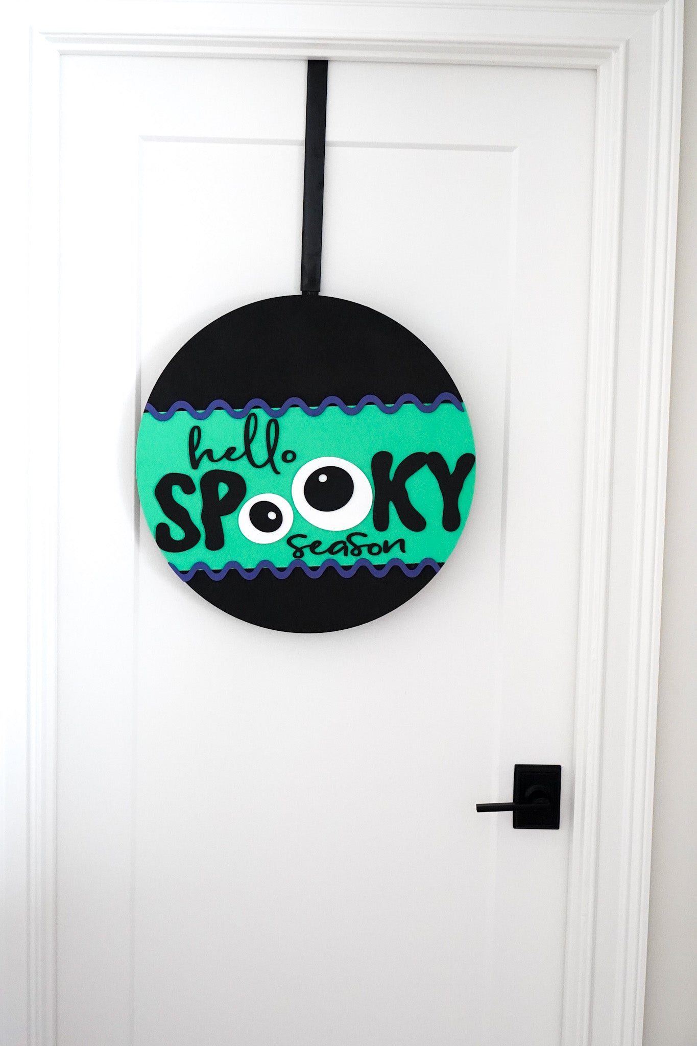 This round wooden sign features a bold black and neon green color palette, layered “hello SPOOKY season” lettering, and adorable 3D googly-style eyes inside the word “Spooky” for a fun, eye-catching look. Wavy purple trim adds the perfect touch of Halloween flair.