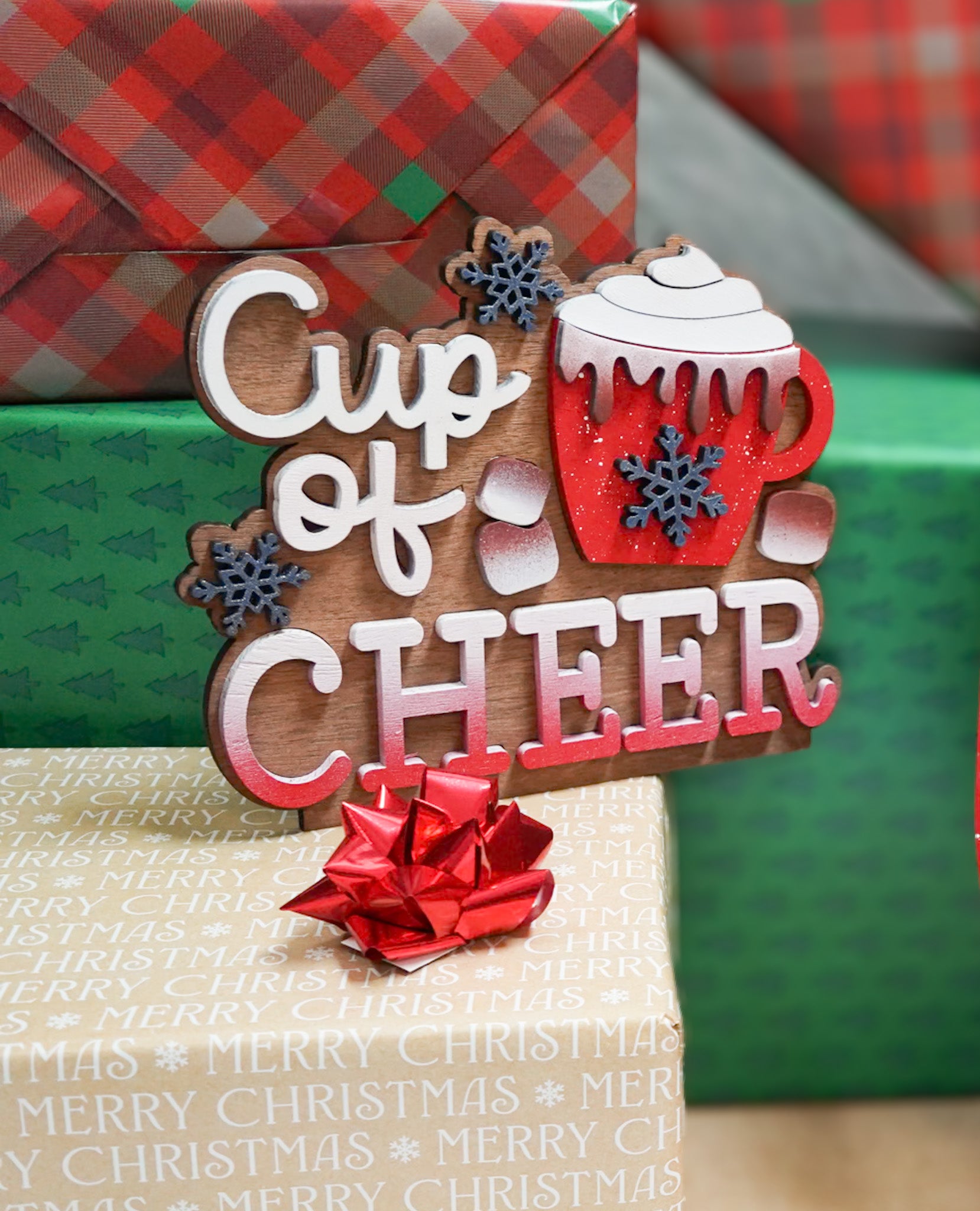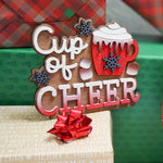Add a warm, festive touch to your kitchen, cocoa bar, or holiday shelf with our handcrafted Cup of Cheer wooden sign. Featuring a bright red mug overflowing with whipped cream, snowflake details, and marshmallow accents, this piece brings instant Christmas coziness to any space.