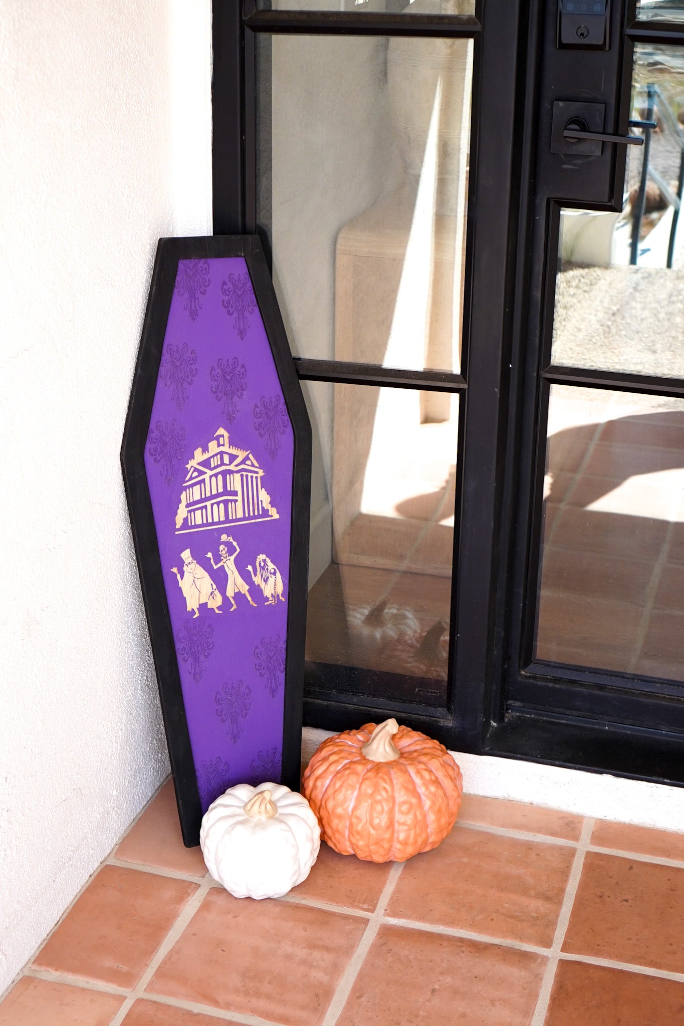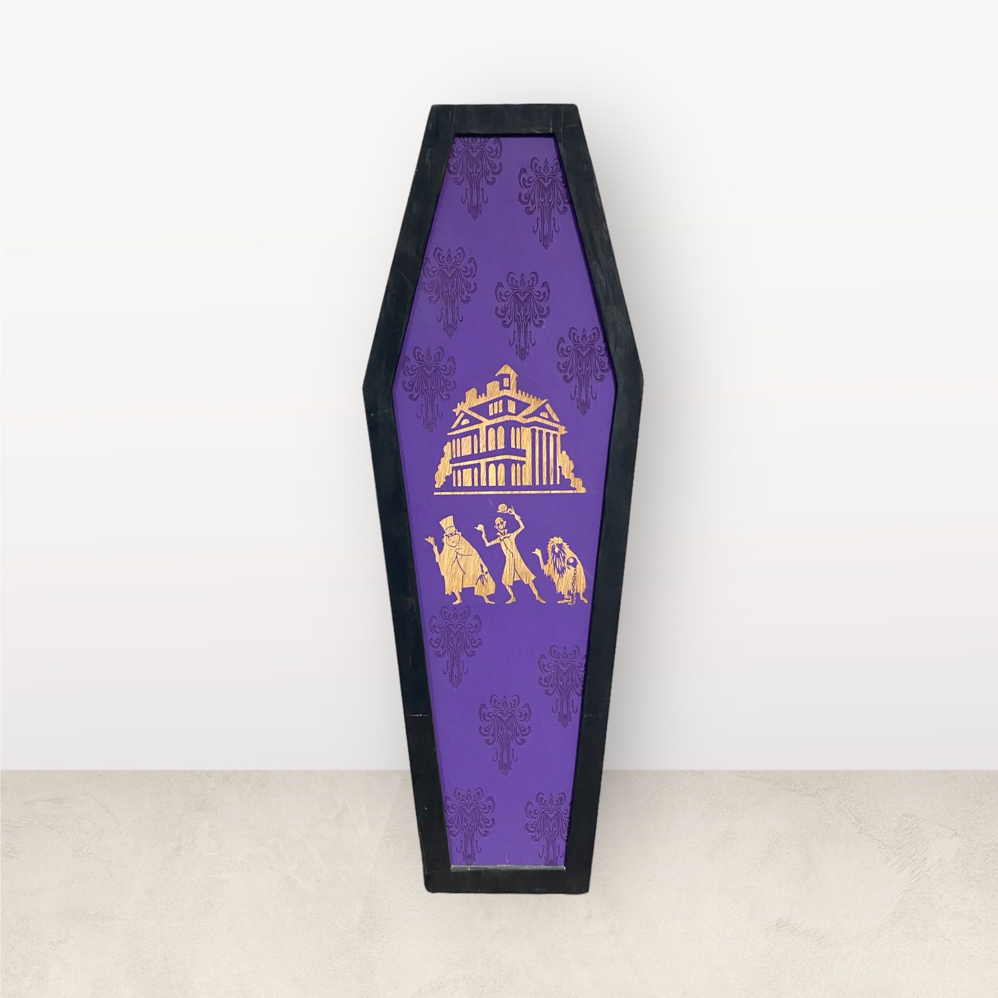 This tall, coffin-shaped wooden sign features a rich purple background with gothic damask patterning and laser-cut silhouettes of the iconic haunted house and hitchhiking ghosts. The black frame gives it a bold, dimensional finish, making it stand out whether displayed on your front porch, entryway, fireplace, or indoor wall.