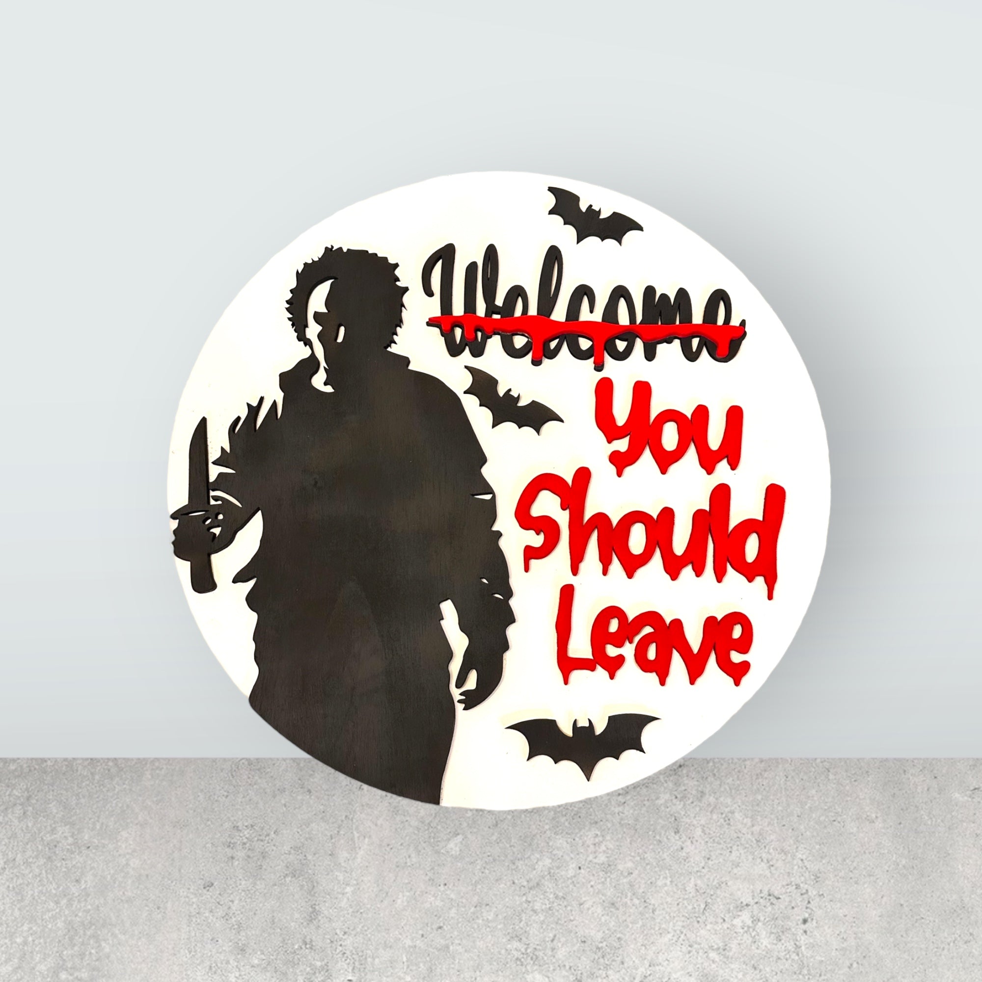 Michael Myers “You Should Leave” Wooden Door Sign – Horror Movie Halloween Decor | Laser Cut Round Sign