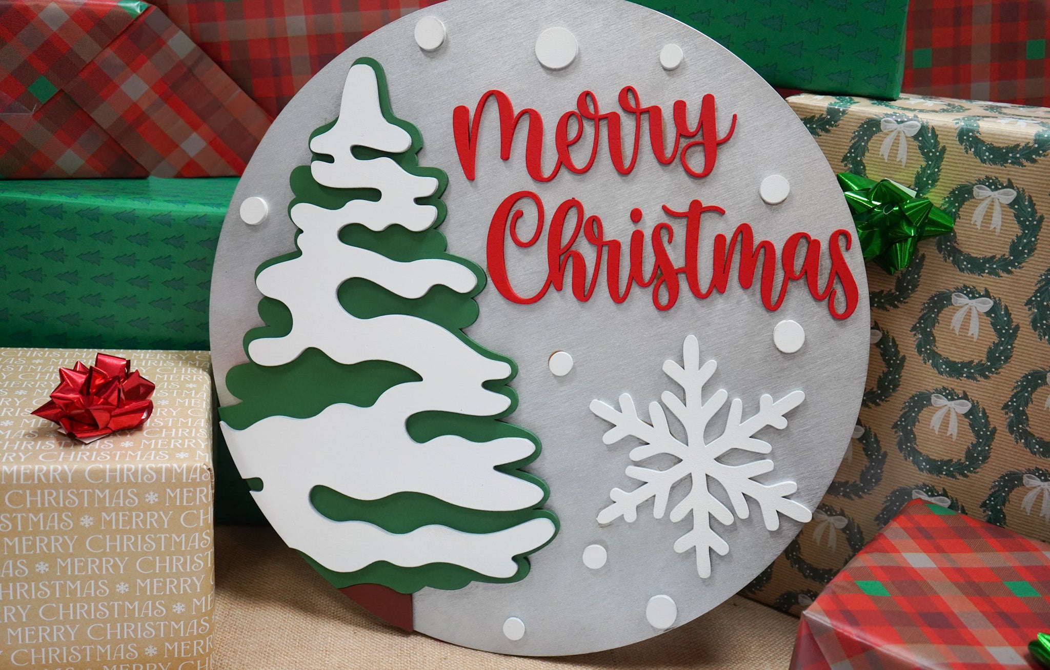 Merry Christmas Swirl Tree Wooden Door Sign – Laser Cut Holiday Décor | Snowflakes & Colorful Accents