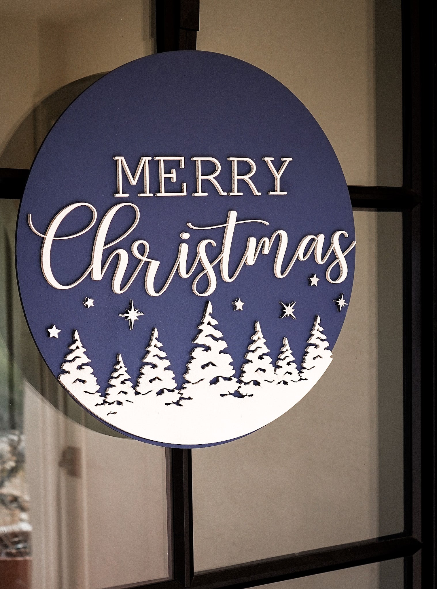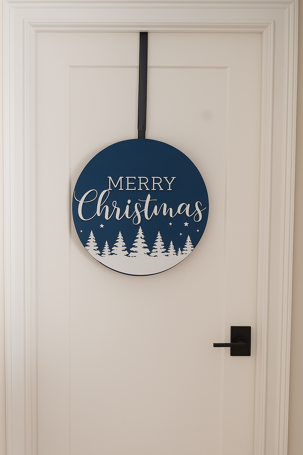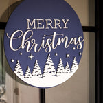 This handcrafted round wooden sign features a rich navy blue background with white layered pine trees and elegant “Merry Christmas” lettering. The contrast of colors captures the serenity of a snowy forest under the stars, making it the perfect accent for your door, mantel, or wall.