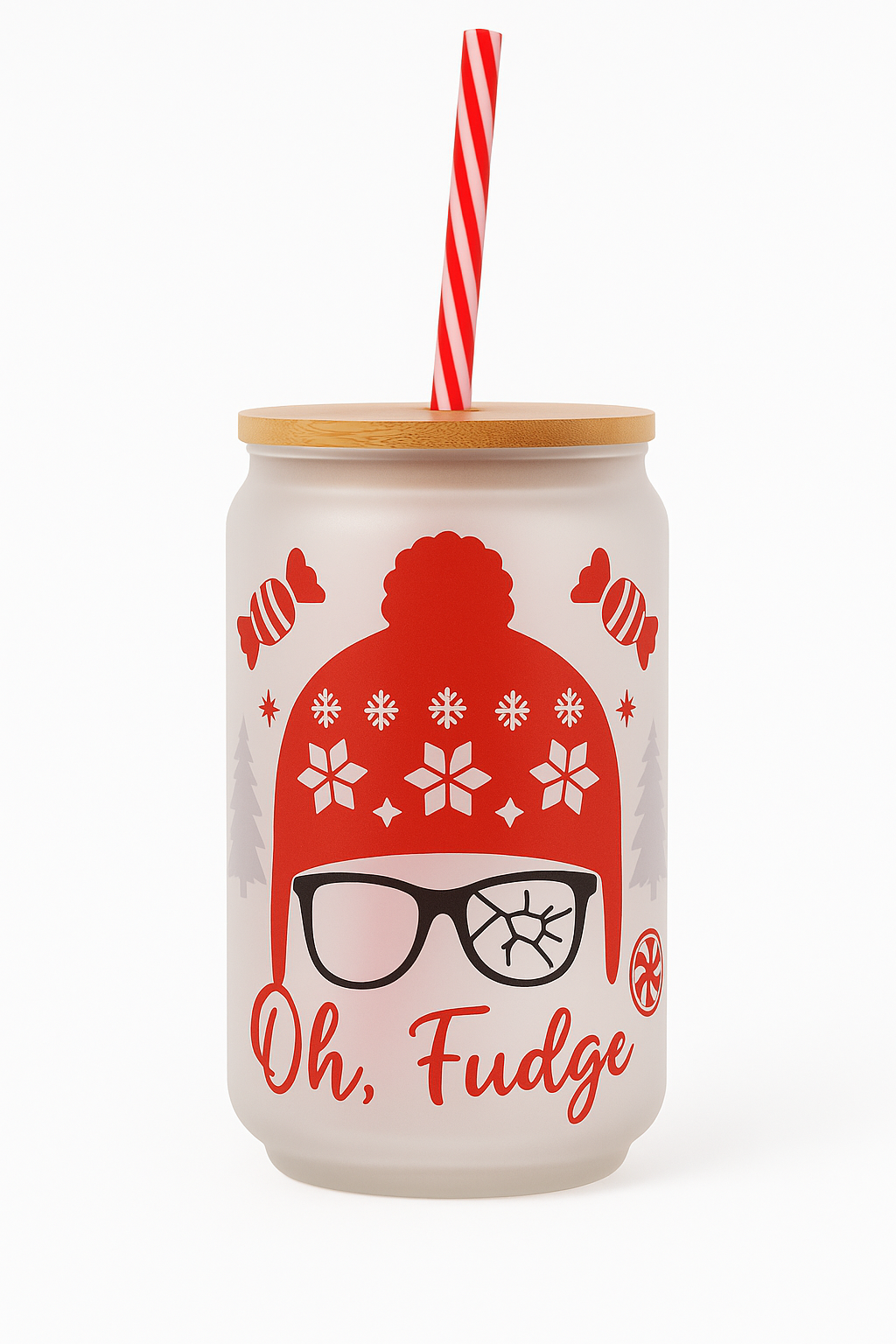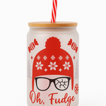 Bring the holiday cheer to every sip with our “Oh, Fudge!” Frosted Glass Can Cup, inspired by cozy winter vibes and sweet Christmas nostalgia. With a playful red beanie illustration, cracked glasses graphic, candy details, and the iconic phrase “Oh, Fudge,” this cup is the perfect festive accessory for cocoa nights, holiday parties, or gifting.